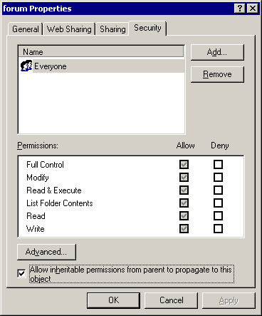 6. Select the Write checkbox in the Allow; column to assign Write permissions to the IUSR account.