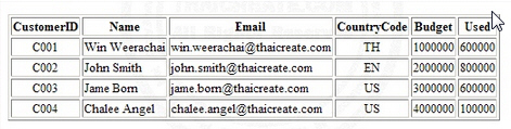 ตัวอย่างข้อมูลที่ได้จาก DataTable เมื่อนำไปใช้กับ DataSource ของ Control ต่าง ๆ