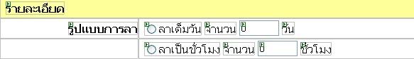 มีลาเต็มวัน (คู่กับ TextBox ตรงจำนวน วัน) กับ ลาเป็นชั่วโมง (คู่กับ TextBox ตรงจำนวน ชั่วโมง)
