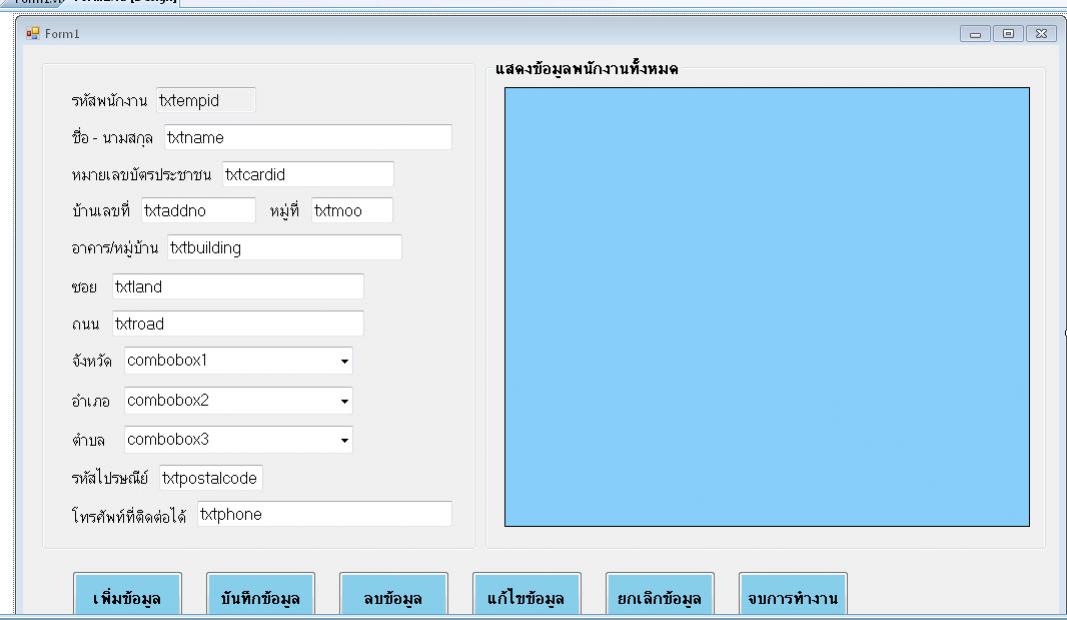 - เมื่อผู้ใช่เลือกอำเภอแล้ว โปรแกรมจะแสดงข้อมูลตำบลของอำเภอที่เลือกใน combobox3 โดยเชื่อมต่อกับตาราง Locality และจะแสดงข้อมูลรัหัสไปษณีย์ของแต่ละอำเภออัตโนมัติ