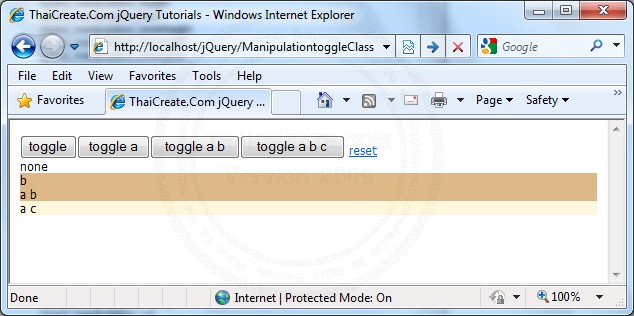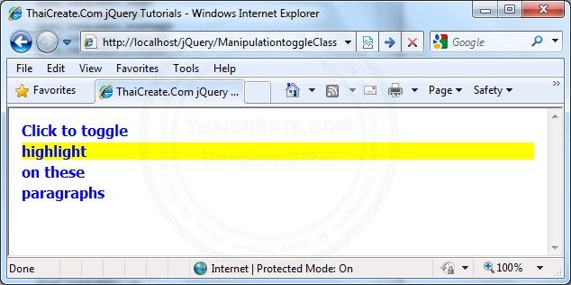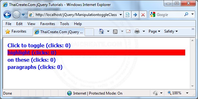 จากตัวอย่างเป็นการใช้ jQuery Manipulation กับ .toggleClass() ในการจัดการกับ element ที่อ้างถึง