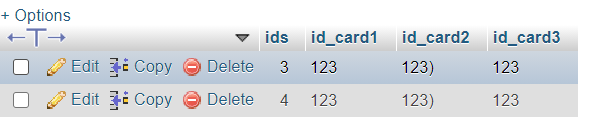 $sql="INSERT INTO card (ids,id_card1,id_card2,id_card3) VALUES (0,'$idcard','$idcard','$idcard')";