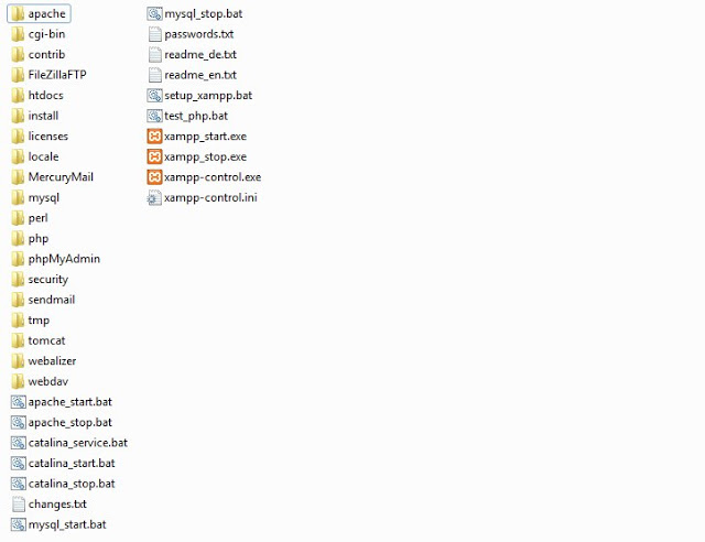 หลังจากดาวน์โหลดเรียบร้อยก็ให้ทำการแตกไฟล์ออกมา ก็จะได้โฟลเดอร์ xampp และเมื่อเปิดเข้าไปก็จะเจอไฟล์ดังรูปซึ่งที่จะมีขั้นตอนการติดตั้งดังนี้