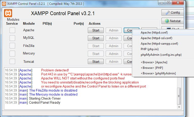 3.4 กรณีที่พอร์ตชนกัน จะต้องแก้ SSL ด้วย เมื่อคลิกที่ปุ่ม Config ให้เลือก Apache (httpd-ssl.conf) (ซึ่งจะเป็นเมนูที่ 2 ถัดจากเมนู httpd.conf)