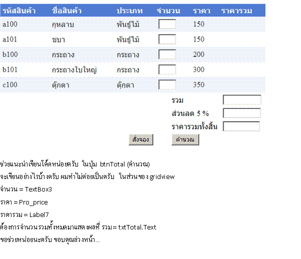 protected void calculate_Click(object sender, EventArgs e) { for (int i = 0; i < GridView1.Rows.Count; i++) { TextBox txtqty = (TextBox)GridView1.Rows[i].Cells[3].FindControl("txtqty"); CheckBox chk1 = (CheckBox)GridView1.Rows[i].Cells[5].FindControl("chk1"); String pid = Convert.ToString(GridView1.Rows[i].Cells[0].Text); DataRow[] drdel = DS.Tables["cart"].Select("pid='" + pid.Trim() + "'"); if (drdel.Length != 0) { if (chk1.Checked) drdel[0].Delete(); else { drdel[0]["qty"] = txtqty.Text.Trim(); drdel[0]["sumprice"] = Convert.ToInt64(drdel[0]["unitprice"]) * Convert.ToInt64(txtqty.Text.Trim()); } } DS.Tables["cart"].AcceptChanges(); } GridView1.DataSource = DS.Tables["cart"]; DataBind(); } int QtyTotal = 0; double SumTotal = 0; protected void GridView1_RowDataBound(object sender, GridViewRowEventArgs e) { if (e.Row.RowType == DataControlRowType.DataRow) { e.Row.Cells[2].HorizontalAlign = HorizontalAlign.Right; e.Row.Cells[4].HorizontalAlign = HorizontalAlign.Right; double uprice = Convert.ToDouble(DataBinder.Eval(e.Row.DataItem, "Unitprice")); e.Row.Cells[2].Text = uprice.ToString("#,##0.00"); if (uprice >= 50) e.Row.BackColor = Color.DeepSkyBlue; else e.Row.BackColor = Color.LightPink; double sprice = Convert.ToDouble(DataBinder.Eval(e.Row.DataItem, "sumprice")); e.Row.Cells[4].Text = sprice.ToString("#,##0.00"); QtyTotal += Convert.ToInt32(DataBinder.Eval(e.Row.DataItem, "qty")); SumTotal += Convert.ToDouble(DataBinder.Eval(e.Row.DataItem, "sumprice")); } else if (e.Row.RowType == DataControlRowType.Footer) { e.Row.Cells[0].Text = "Totals:"; e.Row.Cells[3].Text = QtyTotal.ToString("d"); e.Row.Cells[4].Text = SumTotal.ToString("#,##0.00"); e.Row.Cells[3].HorizontalAlign = HorizontalAlign.Center; e.Row.Cells[4].HorizontalAlign = HorizontalAlign.Right; e.Row.Font.Bold = true; } }