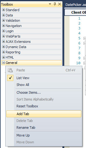 คลิกขวาที่ toolbox เลือก add tab ตั้งชื่อว่า AJAX Control Toolkit