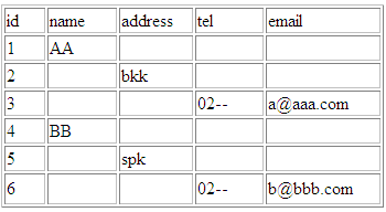 insert into `table2`(id,name,address,tel,email) values (1,'bb',NULL,NULL,NULL),(2,NULL,'spk',NULL,NULL),(3,NULL,NULL,'02--','[email protected]');