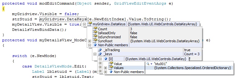 ผมจึงลอง break point ดูที่ even ของ gridview edit ปรากฎว่า gridview datakeys มีค่าอยู่ที่ stu001
