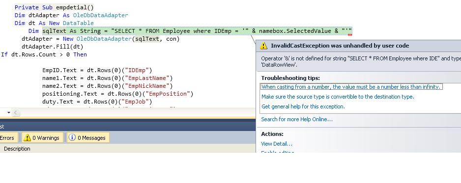 Dim sql As String = "SELECT * FROM Employee WHERE IDEmp = @IDEmp"
