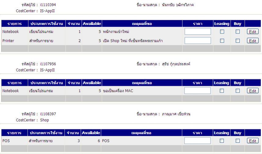 protected void rptDetail_ItemDataBound(object sender, RepeaterItemEventArgs e) { if (e.Item.ItemType == ListItemType.Item || e.Item.ItemType == ListItemType.AlternatingItem) { GridView gv = (GridView)e.Item.FindControl("gvDetail"); gv.DataSource = dtEmpDistinct; gv.DataBind(); } } <asp:Repeater ID="rptDetail" runat ="server" OnItemDataBound="rptDetail_ItemDataBound" > <HeaderTemplate> </HeaderTemplate> <ItemTemplate> <tr> <td> <asp:GridView ID="gvDetail" runat="server" AutoGenerateColumns="false" CellPadding="3" HorizontalAlign="Center" GridLines="Vertical" Width="100%" ShowFooter="True" > <Columns> <asp:TemplateField HeaderText="รายการ"> <ItemTemplate> <asp:Label ID="lblAllRequestType" runat="server" Text='<%#bind("description")%>'> </asp:Label> </ItemTemplate> </asp:TemplateField> <asp:TemplateField HeaderText="จำนวน"> <ItemTemplate> <asp:TextBox ID="txtQuantity" runat="server" Text='<%#bind("quantity")%>' Visible="false"> </asp:TextBox> </ItemTemplate> </asp:TemplateField> <asp:TemplateField HeaderText=""> <ItemTemplate> <asp:Button ID="btnEdit" runat="server" Text="Edit"> </ItemTemplate> </asp:TemplateField> </Columns> </asp:GridView> </td> </tr> </asp:Repeater>
