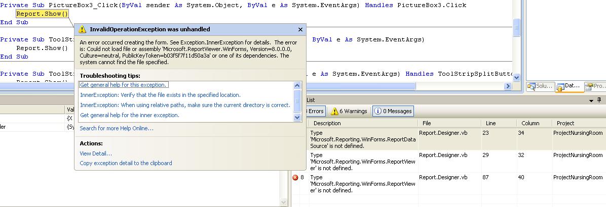 HOME > .NET Framework > Forum > รบกวนถามเกี่ยวกับปัญหา Report ไม่แสดงค่ะ! คือหนูนำ Project เมื่อก่อนมาพัฒนาต่อค่ะ Restore database แล้วใช้งานได้หมดทุกฟอร์มแต่ ฟอร์ม Report ขึ้น error ค่ะ แก้ยังไงดีค่ะหรือต้องลงอะไรเพิ่มเติม !! - -!