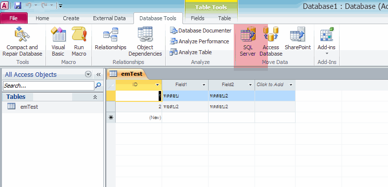 ถ้าเป็น Access 2010 ก็ เข้าไปตามภาพเลยครับ แต่ถ้าเป็นเวอร์ชั่นอื่นๆ ลองหาคำว่า Upsizing ใน Google ครับ รับรองมาครบครับ