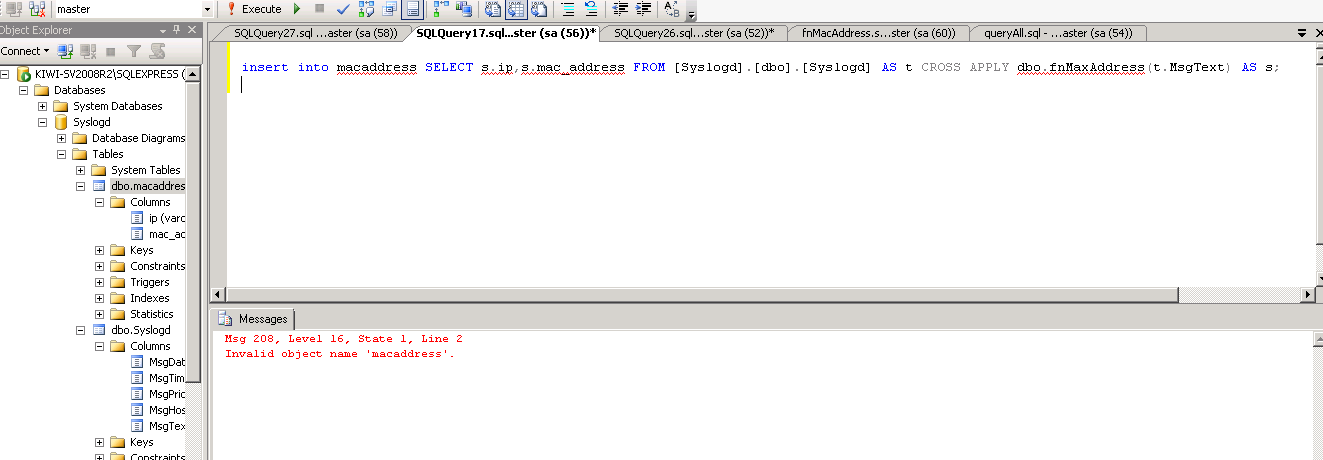 insert into macaddress SELECT s.ip,s.mac_address FROM syslogd AS t CROSS APPLY dbo.fnMaxAddress(t.MsgText) AS s;