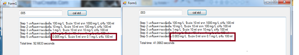 str += Environment.NewLine + "Step " + i + " เตรียมความเข้มข้น " + cri / 10 + " mg/L ปิเปต 10 ml จาก " + cri + " mg/L ปรับ 100 ml";