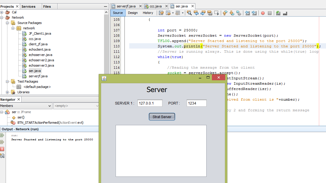 ผมต้องการให้คำว่า "Server Started and listening to the port 25000" แสดงที่ CHATLOG ด้วย แต่มันไม่แสดงนะครับ แถมปุ่ม start ก็ค้างอีก แต่มันใช้ได้นะครับ