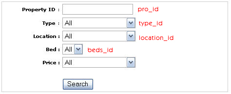$query=mysql_query("SELECT * from dbname WHERE pro_id like '%".$pro_id."%' or type_id like '%".$type_id."%' or location_id like '%".$location_id."%' or beds_id like '%".$beds_id."%' or price like '%".$price."%'");