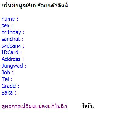 echo "<Font Size=4><B>เพิ่มข้อมูลเรียบร้อยแล้วดังนี้</B><Br><Br>";