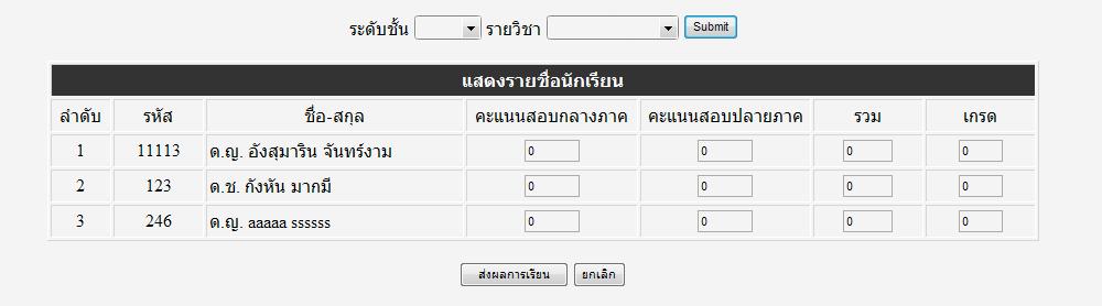 <?php /*** By Weerachai Nukitram ***/ /*** http://www.ThaiCreate.Com ***/ include "Connect.php"; ?> <html> <head> <meta http-equiv="Content-Type" content="text/html; charset=utf-8"> <title>ThaiCreate.Com ListMenu</title> <script language = "JavaScript"> //**** List Province (Start) ***// function ListSubject(SelectValue) { frmMain.ddlSubject.length = 0 //*** Insert null Default Value ***// var myOption = new Option('','') frmMain.ddlSubject.options[frmMain.ddlSubject.length]= myOption <? $intRows = 0; $strSQL = "SELECT * FROM subject inner join level on subject.id_level=level.id_level"; $objQuery = mysql_query($strSQL) or die ("Error Query [".$strSQL."]"); $intRows = 0; while($objResult = mysql_fetch_array($objQuery)) { $intRows++; ?> x = <?=$intRows;?>; mySubList = new Array(); strGroup = <?=$objResult["id_level"];?>; strValue = "<?=$objResult["id_sub"];?>"; strItem = "<?=$objResult["sub_name"];?>"; strItem2 = "<?=$objResult["level_name"];?>"; mySubList[x,0] = strItem; mySubList[x,1] = strGroup; mySubList[x,2] = strValue; mySubList[x,3] = strItem2; if (mySubList[x,1] == SelectValue){ var myOption = new Option(mySubList[x,0], mySubList[x,2]) frmMain.ddlSubject.options[frmMain.ddlSubject.length]= myOption } <? } ?> } //**** List Province (End) ***// </script> <SCRIPT language=JavaScript> function check_number() { e_k=event.keyCode //if (((e_k < 48) || (e_k > 57)) && e_k != 46 ) { if (e_k != 13 && (e_k < 48) || (e_k > 57)) { event.returnValue = false; alert("กรุณาใส่ตัวเลขค่ะ"); } } </script> <script> function calc(){ var txt1 = document.getElementById('txtMid'); var txt2 = document.getElementById('txtFinal'); var txt3 = document.getElementById('txtSum'); if(!isNaN(txt1.value) && txt1.value!="" && !isNaN(txt2.value) && txt2.value!=""){ txt3.value = parseInt(txt1.value)+parseInt(txt2.value); } } </script> <SCRIPT language=JavaScript> function sumScore(arr){ document.all["s["+arr+"]"].value=document.all["m["+arr+"]"].value*1+document.all["f["+arr+"]"].value*1; if(document.all["s["+arr+"]"].value>=80) document.all["g["+arr+"]"].value="A"; else if(document.all["s["+arr+"]"].value>=75 && document.all["s["+arr+"]"].value<=79) document.all["g["+arr+"]"].value="B+"; else if(document.all["s["+arr+"]"].value>=70 && document.all["s["+arr+"]"].value<=74) document.all["g["+arr+"]"].value="B"; else if(document.all["s["+arr+"]"].value>=65 && document.all["s["+arr+"]"].value<=69) document.all["g["+arr+"]"].value="C+"; else if(document.all["s["+arr+"]"].value>=60 && document.all["s["+arr+"]"].value<=64) document.all["g["+arr+"]"].value="C"; else if(document.all["s["+arr+"]"].value>=55 && document.all["s["+arr+"]"].value<=59) document.all["g["+arr+"]"].value="D+"; else if(document.all["s["+arr+"]"].value>=50 && document.all["s["+arr+"]"].value<=54) document.all["g["+arr+"]"].value="D"; else if(document.all["s["+arr+"]"].value<54) document.all["g["+arr+"]"].value="E"; if(document.all["f["+arr+"]"].value>="ขส") document.all["g["+arr+"]"].value="ขส"; if(document.all["m["+arr+"]"].value>="มส") document.all["g["+arr+"]"].value="มส"; else if(document.all["m["+arr+"]"].value>="I") document.all["g["+arr+"]"].value="I"; } </SCRIPT> <style type="text/css"> <!-- .style1 { color: #FFFFFF; font-weight: bold; } --> </style> </head> <form name="frmMain" action="" method="post"> <div align="center">ระดับชั้น <select id="ddlLevel" name="ddlLevel" onChange = "ListSubject(this.value)"> <option selected value=""></option> <? $strSQL = "SELECT * FROM level ORDER BY id_level ASC "; $objQuery = mysql_query($strSQL) or die ("Error Query [".$strSQL."]"); while($objResult = mysql_fetch_array($objQuery)) { ?> <option value="<?=$objResult["id_level"];?>"> <?=$objResult["level_name"];?> </option> <? } ?> </select> รายวิชา <select id="ddlSubject" name="ddlSubject" style="width:120px"> </select> <input type="submit" name="button" id="button" value="Submit"> </div> </form> <table width="950" border="0" align="center" cellpadding="0" cellspacing="0"> <tr> <td><form name="form1" method="get" action="DemoSave.php"> <table width="900" border="1" align="center" cellpadding="2" cellspacing="2"> <tr bgcolor="#333333"> <td height="30" colspan="7"><div align="center" class="style1">แสดงรายชื่อนักเรียน</div></td> </tr> <tr> <td width="50" height="30"><div align="center">ลำดับ</div></td> <td width="80"><div align="center">รหัส</div></td> <td width="250"><div align="center">ชื่อ-สกุล</div></td> <td width="160"><div align="center">คะแนนสอบกลางภาค</div></td> <td width="160"><div align="center">คะแนนสอบปลายภาค</div></td> <td width="100"><div align="center">รวม</div></td> <td width="100"><div align="center">เกรด</div></td> </tr> <? $Level=$_POST["ddlLevel"]; $Subject=$_POST["ddlSubject"]; $strSQL = "select * from student WHERE id_level='$Level' AND id_sub='$Subject'"; $objQuery = mysql_query($strSQL) or die ("Error Query [".$strSQL."]"); ?> <? $i=0; while($objResult=mysql_fetch_array($objQuery)) { $i++; ?> <tr> <td height="30"><div align="center"> <? echo $i;?> </div></td> <td><div align="center"><?=$objResult["id_student"];?> <input type="hidden" name="hdId" id="hdId" value="<?=$objResult["id_student"];?>"> </div></td> <td><div align="left"> <?=$objResult["stu_befor"];?> <?=$objResult["stu_name"];?> <?=$objResult["stu_sur"];?> <input type="hidden" name="hdPrefix" id="hdPrefix" value="<?=$objResult["stu_befor"];?>"> <input type="hidden" name="hdFirstName" id="hdFirstName" value="<?=$objResult["stu_name"];?>"> <input type="hidden" name="hdLastName" id="hdLastName" value="<?=$objResult["stu_sur"];?>"> </div></td> <td><div align="center"> <INPUT id=m[1]3 maxLength=4 onchange=sumScore(1); size=4 value=0 name=m[1]> </div></td> <td><div align="center"> <INPUT id=f[1]3 maxLength=4 onchange=sumScore(1); size=4 value=0 name=f[1]> </div></t