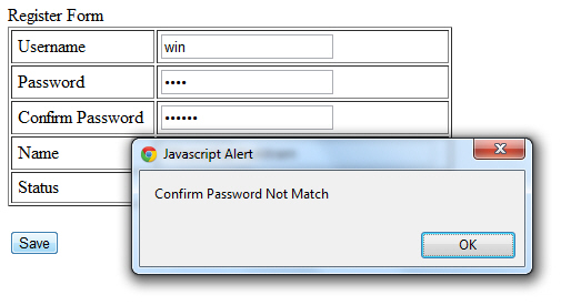 <html> <head> <title>ThaiCreate.Com Tutorials</title> <meta http-equiv="Content-Type" content="text/html; charset=utf-8"></head> <body> <script language="javascript"> function fncSubmit() { if(document.form1.txtUsername.value == "") { alert('Please input Username'); document.form1.txtUsername.focus(); return false; } if(document.form1.txtPassword.value == "") { alert('Please input Password'); document.form1.txtPassword.focus(); return false; } if(document.form1.txtConPassword.value == "") { alert('Please input Confirm Password'); document.form1.txtConPassword.focus(); return false; } if(document.form1.txtPassword.value != document.form1.txtConPassword.value) { alert('Confirm Password Not Match'); document.form1.txtConPassword.focus(); return false; } if(document.form1.txtName.value == "") { alert('Please input Name'); document.form1.txtName.focus(); return false; } document.form1.submit(); } </script> <form name="form1" method="post" action="save_register.php" OnSubmit="return fncSubmit();"> Register Form <br> <table width="400" border="1" style="width: 400px"> <tbody> <tr> <td width="125"> Username</td> <td width="180"> <input name="txtUsername" type="text" id="txtUsername" size="20"> </td> </tr> <tr> <td> Password</td> <td><input name="txtPassword" type="password" id="txtPassword"> </td> </tr> <tr> <td> Confirm Password</td> <td><input name="txtConPassword" type="password" id="txtConPassword"> </td> </tr> <tr> <td> Name</td> <td><input name="txtName" type="text" id="txtName" size="35"></td> </tr> <tr> <td> Status</td> <td> <select name="ddlStatus" id="ddlStatus"> <option value="ADMIN">ADMIN</option> <option value="USER">USER</option> </select> </td> </tr> </tbody> </table> <br> <input type="submit" name="Submit" value="Save"> </form> </body> </html>