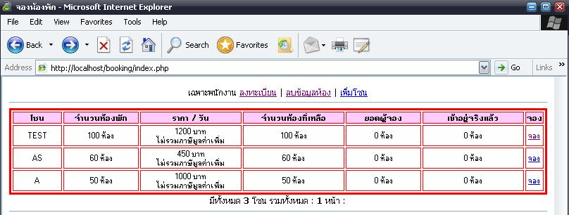 3.เมื่อกรอกข้อมูลเสร็จแล้ว กดตกลง ก็จะวิ่งกลับมาหน้าหลักเอง แล้วหน้าหลักก็จะเปลี่ยนไปตามรูปนี้ จะสังเกตว่า ยอดผู้จอง เพิ่มขึ้นเป็น10 ก็เพราะ มีคนจอง10ห้อง แต่ยังไม่มีอยู่จริง
