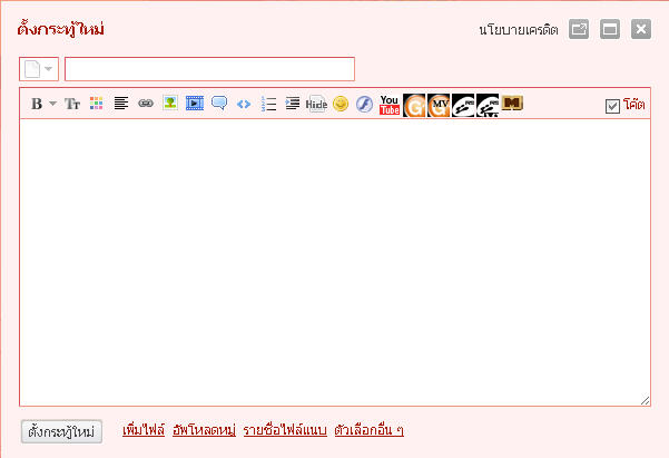 ใส่แฟลช ใส่รูป ใส่ไฮเปอร์ลิ้งค์ ใส่อีเมล์ ใส่ลิ้งค์ FTP| ใส่แถวของตาราง ใส่คอลัมน์ตาราง| ตัวยก ตัวห้อย ตัวพิมพ์ดีด| ใส่โค้ด ใส่การอ้างถึงคำพูด| ใส่ลีสต์