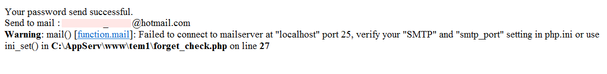 <?PHP header("Content-Type: text/html; charset=utf-8"); require("connect/connect.inc"); $strSQL = "SELECT * FROM member WHERE names = '".trim($_POST['names'])."' OR email = '".trim($_POST['email'])."' "; $objQuery = mysql_query($strSQL); $objResult = mysql_fetch_array($objQuery); if(!$objResult) { echo "Not Found Username or Email!"; } else { echo "Your password send successful.<br>Send to mail : ".$objResult["email"]; $strTo = $objResult["email"]; $strSubject = "Your Account information username and password."; $strHeader = "Content-type: text/html; charset=utf-8\n"; $strHeader .= "From: Webmaster\nReply-To: [email protected]"; $strMessage = ""; $strMessage .= "Welcome : ".$objResult["firstname"]."<br>"; $strMessage .= "Username : ".$objResult["names"]."<br>"; $strMessage .= "Password : ".$objResult["passwd"]."<br>"; $strMessage .= "=================================<br>"; $strMessage .= "THANK YOU<br>"; $flgSend = mail($strTo,$strSubject,$strMessage,$strHeader); } mysql_close(); ?>