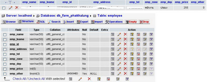 <?php require_once('../Connections/connect.php'); ?> <?php if (!function_exists("GetSQLValueString")) { function GetSQLValueString($theValue, $theType, $theDefinedValue = "", $theNotDefinedValue = "") { $theValue = get_magic_quotes_gpc() ? stripslashes($theValue) : $theValue; $theValue = function_exists("mysql_real_escape_string") ? mysql_real_escape_string($theValue) : mysql_escape_string($theValue); switch ($theType) { case "text": $theValue = ($theValue != "") ? "'" . $theValue . "'" : "NULL"; break; case "long": case "int": $theValue = ($theValue != "") ? intval($theValue) : "NULL"; break; case "double": $theValue = ($theValue != "") ? "'" . doubleval($theValue) . "'" : "NULL"; break; case "date": $theValue = ($theValue != "") ? "'" . $theValue . "'" : "NULL"; break; case "defined": $theValue = ($theValue != "") ? $theDefinedValue : $theNotDefinedValue; break; } return $theValue; } } mysql_select_db($database_connect, $connect); $query_Recordset1 = "SELECT * FROM employee"; $Recordset1 = mysql_query($query_Recordset1, $connect) or die(mysql_error()); $row_Recordset1 = mysql_fetch_assoc($Recordset1); $totalRows_Recordset1 = mysql_num_rows($Recordset1); ?><meta http-equiv="Content-Type" content="text/html; charset=utf8" /> <style type="text/css"> <!-- .style1 {font-size: 24px} .style2 {font-size: 18px} --> </style> <form action="<?php echo $_SERVER['PHP_SELF']; ?>" method="post"> <?php ?> <p align="center" class="style1">เงินเดือนพนักงาน</p> <p align="center" class="style2">ประจำเดือน / ปี</p> <p align="center" class="style2"> <select name="select" id="select"> <option>มกราคม</option> <option>กุมพาพันธ์</option> <option>มีนาคม</option> <option>เมษายน</option> <option>พฤษภาคม</option> <option>มิถุนายน</option> <option>กรกฎาคม</option> <option>สิงหาคม</option> <option>กันยายน</option> <option>ตุลาคม</option> <option>พฤศจิกายน</option> <option>ธันวาคม</option> </select> <select name="select2" id="select2"> <option>2554</option> <option>2555</option> <option>2556</option> <option>2557</option> <option>2558</option> <option>2559</option> <option>2560</option> <option>2561</option> <option>2562</option> <option>2563</option> </select> </p> <table width="898" border="1" align="center"> <tr> <td width="52">ลำดับที่</td> <td width="159"><div align="center">ชื่อ </div></td> <td width="162"><div align="center">นามสกุล</div></td> <td width="150"><div align="center">แผนก</div></td> <td width="157"><div align="center">อัตราค่าจ้าง</div></td> <td width="81">วันมาทำงาน</td> <td width="91"><div align="center">รวมเงิน</div></td> </tr> <tr> <?php $sqltxt = "SELECT * FROM employee"; $db_query=mysql_db_query($db,$sql); $sub_total = $row_Recordset1['emp_price'] * $row_Recordset1['emp_other'] ; $empoth = $row_Recordset1['emp_other']; { echo " <td align=center></td> <td align=center>{$row_Recordset1['emp_name']}</td> <td align=center>{$row_Recordset1['emp_lname']}</td> <td align=center>{$row_Recordset1['emp_dep']}</td> <td align=center>{$row_Recordset1['emp_price']}</td> <td align=center> <input type=text size=10 name=$empoth value={$row_Recordset1['emp_other']} /> </td> <td>$sub_total</td> </tr>"; } ?> </tr> </table> <p align="center" class="style2"> <label> <input type="submit" name="button" id="button" value="บันทึก" /> </label> <label> <input type="submit" name="button2" id="button2" value="ลบข้อมูล" /> </label> </p> <label></label> <p> </p> <p> </p> <p align="left" class="style2"> </p> <p align="left"> </p> <p> </p> <p> </p> <p> </p> </form> <?php mysql_free_result($Recordset1); ?>