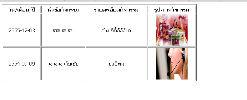 <? include ("ConnectActivity.php"); mysql_query ("SET NAMES utf8") or die (mysql_errno()); $sql = "SELECT * FROM `activity`"; $result = mysql_query($sql); echo "<table width='100%' border='1' bordercolor='' bgcolor='' ><tr align='center'> <tr align='center'> <td><b>วัน/เดือน/ปี</b></td> <td><b>หัวข้อกิจกรรม</b></td> <td><b>รายละเอียดกิจกรรม</b></td> <td><b>รูปภาพกิจกรรม</b></td> </tr>"; while($row=mysql_fetch_array($result)){ $date_activity = DateThai($row["date_activity"]); $head_activity= $row["head_activity"]; $detail_activity = $row["detail_activity"]; $pic_activity= $row["pic_activity"]; echo "<tr align='center'>"; echo "<td>$date_activity</td>"; echo "<td>$head_activity</td>"; echo "<td>$detail_activity</td>"; echo "<td><img width=100 height=100 src='$pic_activity'></td>"; } ?>