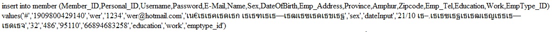 $sql = "INSERT INTO member(Member_ID,Personal_ID,Username,Password,E-Mail,Name,Sex,DateOfBirth,Emp_Address,Province,Amphur,Zipcode,Emp_Tel,Education,Work,EmpType_ID)values('".$member_id."','".$id_card_txt."','".$user_name."','".$pwd_name1."','".$email."','".$name."','".$sex."','".$dateInput."','".$address."','".$province."','".$amper."','".$zipcode."','".$phone."','".$education."','".$work."','".$emptype_id."');";