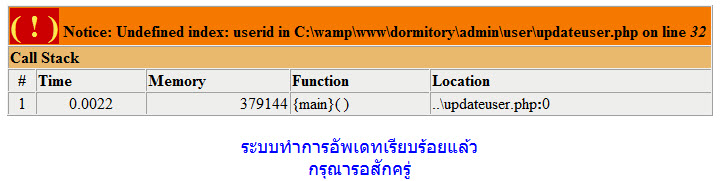 include "../../config/connect_db.php"; $strSQL = "UPDATE user SET User_Fname='$_POST[txtuserFname]', User_Lname='$_POST[txtuserLname]', User_Address ='$_POST[txtAddress]', User_Email ='$_POST[txtEmail]', User_Moblie ='$_POST[txtMoblie]' "; $strSQL .= "WHERE User_ID ='$_POST[userid]'; "; // อันนี้ echo "<p class='bighand'>ระบบทำการอัพเดทเรียบร้อยแล้ว<br>กรุณารอสักครู่</p><br>"; echo "<img src='../../images/line.gif' width='576' height='19'>"; mysql_query( $strSQL, $conn ) or die ( "ไม่สามารถอัพเดทข้อมูลผู้เช่า $_POST[userid] ได้." . mysql_error()) ;