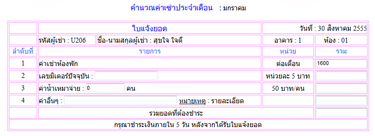 ภาพนี้ก่อนคำนวณจะต้องเลือกผู้เช่าก่อนครับ ในที่นี้ยกตัวอย่าง ผู้เช่า สุขใจ ใจดี รหัสผู้เช่า U301 โดยส่งค่าเป็น GET ครับ ไปยังหน้า showmonth.php ซึ่งเป็นภาพแสดงข้อมูล สุขใจ ใจดี รหัสผู้เช่า U301 ด้านล่างจะแสดงค่าเช่าในแต่ละเดือนครับ โดยเรียงลำดับมกรา - ธันวาคม แสดงค่าใช้จ่าย ทั้งหมดที่ต้องจ่ายแต่ละเดือนนี้ และคอมลัมน์ สถานะ ถ้าไม่มี ก็ - ถ้ามี จะเช็คสถานะว่าเคยจ่ายหรือยัง ถ้าจ่ายแล้ว จะ / ถ้ายังไม่ใส่ จะ x โดยตอนแรกจะ - ก่อน เมื่อคำนวณแล้วจะเปลี่ยนเป็น x และจะ / ได้ก็ต่อเมื่อติกช่อง checkbox แต่ละเดือน ถ้าจ่ายแล้วก็ติกช่องจ่ายแล้ว สถานะจะเป็น / ทันที สำหรับตอนนี้ อยู่ที่การคำนวณครับ โดยกดปุ่มรูป เครื่องคิดเลข เมื่อ คลิกแล้ว จะส่งค่า GET ค่า รหัสผู้เข้า U301 และค่าGET รหัสเดือน ในที่นี้เป็นเดือนมกราคม ส่งค่ามา 01 จากนั้นก็ไปหน้า calrental.php ซึ่งแสดงข้อมูลทุกอย่าง โดยส่งค่า ตารางที่กล่าวไว้ด้านบนมาส่งที่ หน้า calrental.php ดังภาพ