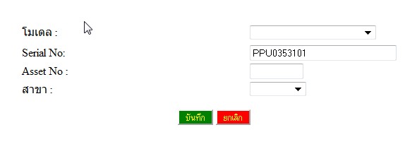 <form action="Insert_tb_project_PEPSI.php" method="POST"> <table width ="550" align="center"> <tr> <?php //**** Call to class function select record ****// $clsMyDB->strTable = "tb_model"; //พิมพ์ เพื่อแจ้งค่าที่รับมาจากหน้าเวปก่อนหน้านี้ // echo "test".$_GET["asset_no"]; $clsMyDB->strCondition = " model<>'null'"; $clsMyDB->strColumn="model"; ?> <td align="left" width="200"> โมเดล : </td> <td align="left" width="200"> <select name="model" OnChange="window.location='?model_selected='+this.value;" > <option value=" "></option> <?php foreach($clsMyDB->fncSelectRecord_array() as $rows) { ?> <option value="<? echo $rows["model"]; ?>"> selected <? echo $rows["model"]; ?></option> <?php } ?> </select> </td> </tr> <tr> <tr> <?php //echo $_GET["model_selected"]; //debug //**** Call to class function select record ****// $clsMyDB->strTable = "tb_model"; //พิมพ์ เพื่อแจ้งค่าที่รับมาจากหน้าเวปก่อนหน้านี้ // echo "test".$_GET["asset_no"]; $clsMyDB->strCondition = " model= "."'".$_GET["model_selected"]."'"; $objSelect = $clsMyDB->fncSelectRecord(); ?> <tr> <td align="left" width="200">Serial No: </td> <td align="left" width="200"><input name="serial_no" value="<? echo $objSelect["model_serial"] ?>" type="text" size="32" maxlength="30"></td> </tr> <tr> <td align="left" width="300">Asset No :</td> <td align="left" width="200"><input name="asset_no" type="text" size="10" maxlength="15"> </td> </tr> <tr> <?php //**** Call to class function select record ****// $clsMyDB->strTable = "tb_branch"; //พิมพ์ เพื่อแจ้งค่าที่รับมาจากหน้าเวปก่อนหน้านี้ // echo "test".$_GET["asset_no"]; $clsMyDB->strCondition = " name<>'null'"; $clsMyDB->strColumn="name"; ?> <td align="left" width="200"> สาขา : </td> <td align="left" width="200"> <select name="branch" > <option value=" "></option> <?php foreach($clsMyDB->fncSelectRecord_array() as $rows) { ?> <option value="<? echo $rows["name"]; ?>"><? echo $rows["name"]; ?></option> <?php } ?> </select></td> </tr> </table> <p align="center"><input name="btnSubmit" type="submit" style="background-color:green; color:yellow;" value="บันทึก"> <input name="btnReset" type="reset" style="background-color:red; color:yellow;"value="ยกเลิก"></p> </form>