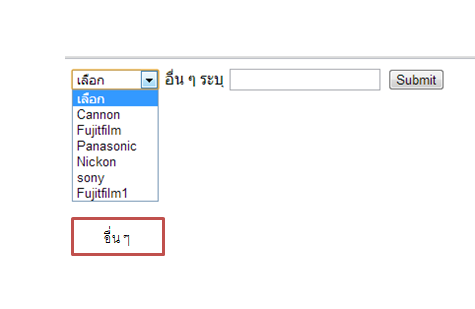 <!DOCTYPE html PUBLIC "-//W3C//DTD XHTML 1.0 Transitional//EN" "http://www.w3.org/TR/xhtml1/DTD/xhtml1-transitional.dtd"> <html xmlns="http://www.w3.org/1999/xhtml"> <head> <meta http-equiv="Content-Type" content="text/html; charset=utf-8" /> <title>Untitled Document</title> <script type="text/javascript" src="http://code.jquery.com/jquery.js"></script> <script type="text/javascript"> $(document).ready(function(){ $("#LIST").change(function(){ if($(this).val()==0){ var NE = "" NE += "<label for=\"txt1\">กรุณาระบุ</label>"; NE += "<input type=\"text\" name=\"txt1\" id=\"txt1\" />"; NE += "<input type=\"button\" name=\"button\" id=\"BT1\" value=\"เพิ่ม\" />"; $("#OTHER").html(NE); }else{ $("#OTHER").html(""); } }); }); </script> </head> <body> <p> <label for="LIST">โปรดเลือก</label> <select name="LIST" id="LIST"> <option value="1">aaa</option> <option value="2">bbb</option> <option value="3">ccc</option> <option value="0">Other</option> </select> <div id="OTHER"></div> </p> </body> </html>