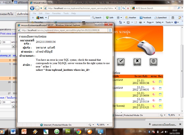 พี่ครับ คือมันerrorอะครับ ผมทำโปรเจคเกี่ยวกับระบบแจ้งซ่อมอะครับ ที่นี้ว่าผมต้องรีบส่งอาจารย์แล้วอะครับ ผมจะบอกสาเหตุคร่าวให้ฟังนะครับ มันมีไฟล์อยู่ไฟลหนึ่ง เกี่ยวกับสำนักงานแต่ผมให้เพื่อนปิดไปแล้วซึ่งไฟล์ยังอยู่ แต่ที่นี้เวลากรอกรายละเอียดแล้วส่งให้มันรีวิว มันก็ดันเป็นอย่างที่เห็นในรูป ซึ่งผมไม่รู้ว่าจะต้องแก้ไขตังไหน แล้วต้องพิมคำสั่งอะรัยถึงจะแก้ไขได้ รบกวนหน่อยนะคร๊าฟ