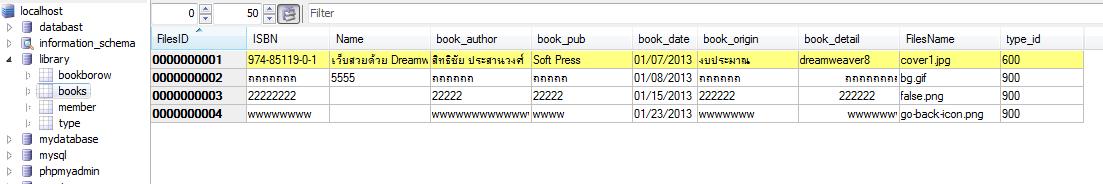 สอบถามการดึงข้อมูลจากฐานข้อมูลมาแสดงเป็นตารางรายการหนังสือ โดยวนลูปลงมาเรื่อยๆและแบ่งหน้า 10 เล่นต่อหน้า