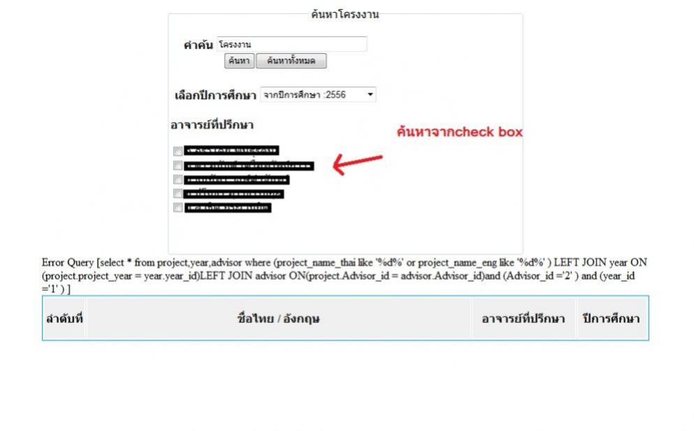 <fieldset style="width:500px;height:350px;" align="center"><legend align="center">การค้นหา</legend> <br> <form name="frmSearch" method="get" action="<?=$_SERVER['SCRIPT_NAME'];?>" > <table width="300" border="0" > <tr> <th>คำค้น <input name="txtKeyword" type="text" id="txtKeyword" size="30"value="<?=$_GET["txtKeyword"];?>"> <input type="submit" value="ตกลง"><th> </tr> </table> <br> $link=mysql_connect("localhost","root","1234") or die("error".mysql_error()); mysql_select_db("project_manage",$link); <!-- ____________เงื่อนไขที่ 1_________________________ --> เลือกปีการศึกษา <select name="years" id="years"> <?php $q=" select * from year "; $qr=mysql_query($q); ?><option >----------กรุณาเลือก---------- </option> <?while($rs=mysql_fetch_array($qr)){ ?> <option value="<?=$rs['year_id']?>">จากปีการศึกษา :<?=$rs['ref_project_year']?> </option> <? } ?> </select> <?php $link=mysql_connect("localhost","root","1234") or die("error".mysql_error()); mysql_select_db("project_manage",$link); ?> <!-- _______________เงื่อนไขที่ 2_______________________ --> <b>อาจารย์ที่ปรึกษา </b><br> <?php $q=" select * from advisor "; $qr=mysql_query($q); while($ad= mysql_fetch_array($qr)){ ?> <br> <td><input name="Advisor_id" type="checkbox" value="<?echo $ad['Advisor_id']?>"><? echo $ad['Advisor_name']?> </td> <?}?> <!-- _______________หัวข้อ________________________ --> </form> </fieldset > <table width="868" height="65" border="1" align="center" bordercolor=" #EAEAEA" bgcolor="#F0F0F0"> <tr bordercolor= "#FFFFFF"> <th width="55" bordercolor= "#FFFFFF"> <div align="center">ลำดับที่</div></th> <th> <div align="center">ชื่อ</div> </th> <th width="144" bordercolor= "#FFFFFF"> <div align="center">อาจารย์ที่ปรึกษา</div></th> <th width="96" bordercolor= "#FFFFFF"> <div align="center">»ปีการศึกษา</div></th> </tr> <!-- ________________ค้นหา___________________ --> <? if($_GET["txtKeyword"] != "") { $strSQL="select * from project,year,advisor where (project_name_thai like '%".$_GET['txtKeyword']."%' or project_name_eng like '%".$_GET['txtKeyword']."%' ) "; $strSQL.="LEFT JOIN year ON(project.project_year = year.year_id)"; $strSQL.="LEFT JOIN advisor ON(project.Advisor_id = advisor.Advisor_id)"; $strSQL.="and (Advisor_id ='$Advisor_id' ) "; $strSQL.="and (year_id ='$years' ) "; } ?> <!-- ________________แสดงผล_____________________________ --> <?$objQuery = mysql_query($strSQL) or die ("Error Query [".$strSQL."]"); while($objResult = mysql_fetch_array($objQuery)) { $project_id = $objResult[project_id]; $i++; ?><tr bordercolor= "#FFFFFF"> <td bordercolor= "#FFFFFF"><div align="center"><? echo "$i";?></div></td> <td> <a href="form_show_project.php?project_id=<?=$project_id?>" ><?=$objResult["project_name_thai"];?>/<?=$objResult["project_name_eng"];?></a></td> <td bordercolor=" #FFFFFF"><div align="center">><?=$objResult["Advisor_name"];?></div></td> <td align="right" bordercolor= "#FFFFFF"> <div align="center"><?=$objResult["ref_project_year"];?></div> </td> </tr> <?}?> </table>