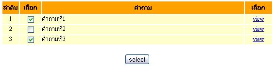 <form name="frmMain" action="2.php" method="post" > <table width="559" border="1" align="center" cellpadding="0" cellspacing="0" bordercolor="#FFFFFF"> <tr align="center" bgcolor="#FFA200"> <td width="34" height="28"><span class="style50 style49"><strong><span class="style21 style24 style36 style49">ลำดับ</span></strong></span></td> <td width="44"><span class="style50 style49"><strong><span class="style47"><span class="style84">เลือก</span></span></strong></span></td> <td width="415"><span class="style50 style49"><strong><span class="style47"><span class="style84">คำถาม</span></span></strong></span></td> <td width="56"><span class="style50 style49"><strong><span class="style47"><span class="style84">เลือก</span></span></strong></span></td> </tr> <? while($objResult2 = mysql_fetch_array($objQuery2)) { ?> <tr bgcolor="#FFFFCC"> <td height="20" align="center" valign="top" class="style37"> <?=$a;?> </td> <td align="center" valign="top" class="style37"><input type="checkbox" name="chk[]" value="<?=$objResult2["id"];?>"></td> <td align="left" valign="top" class="style37"><?=$objResult2["question"];?></td> <td align="center" valign="top" class="style37"> <? $id=$objResult2["id"]; echo"<a href=JavaScript: onClick=window.open('editquiz.php?id=$id','','width=600,height=520');>view</a>";?> </td> <? $a++; }?> </tr> </table> <p> <input type="submit" name="select" value="select"> </p> </form>