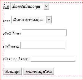 นี้คือไฟล์หน้ากรอกข้อมูลที่ผมสร้างไว้อะครับ คือชั้นปี สาขา จะให้เลือกแบบธรรมดา แล้วส่งข้อมูลไปเก็บในฐาน ส่วนหัสนักศึกษาผมจะใช้ของมหาลัยเลย แล้วส่งไปเก็บในฐานเดียวกัน ส่วน code แรก เป็นโค้ดกำกับ เช่น ED-CO เป็นโค้ดที่แจกให้เฉพาะเด็กเรียนคอม เด็กที่เรียนเอกอื่นจะนำไปใช้ไม่ได้ หลักที่ผมคิดคือว่า เวลาเลือกสาขา ต้องเลืกให้ตรงกับโค๊ด ถ้าเลือกผิดก็ใช้ไม่ได้ เกิดถ้าเลือกถูกรหัสก็จะไปเข้าเด็กเอกนั้น ส่วน code ตัวต่อมา ผมกำหนดไป 15 ตัว มีทั้งตัวเลขและอังกฤษ ซึ่งโค๊ดตัวนี้ จะเป็นการเช็คการเข้ากิจกรรมเลย ซึ่งผมว่าจะเพิ่มช่องมาอีกช่องคือช่องคะแนนที่กรอกไว้แล้ว คือพอส่งโค๊ดไปก็ส่งคะแนนไปด้วยเลย