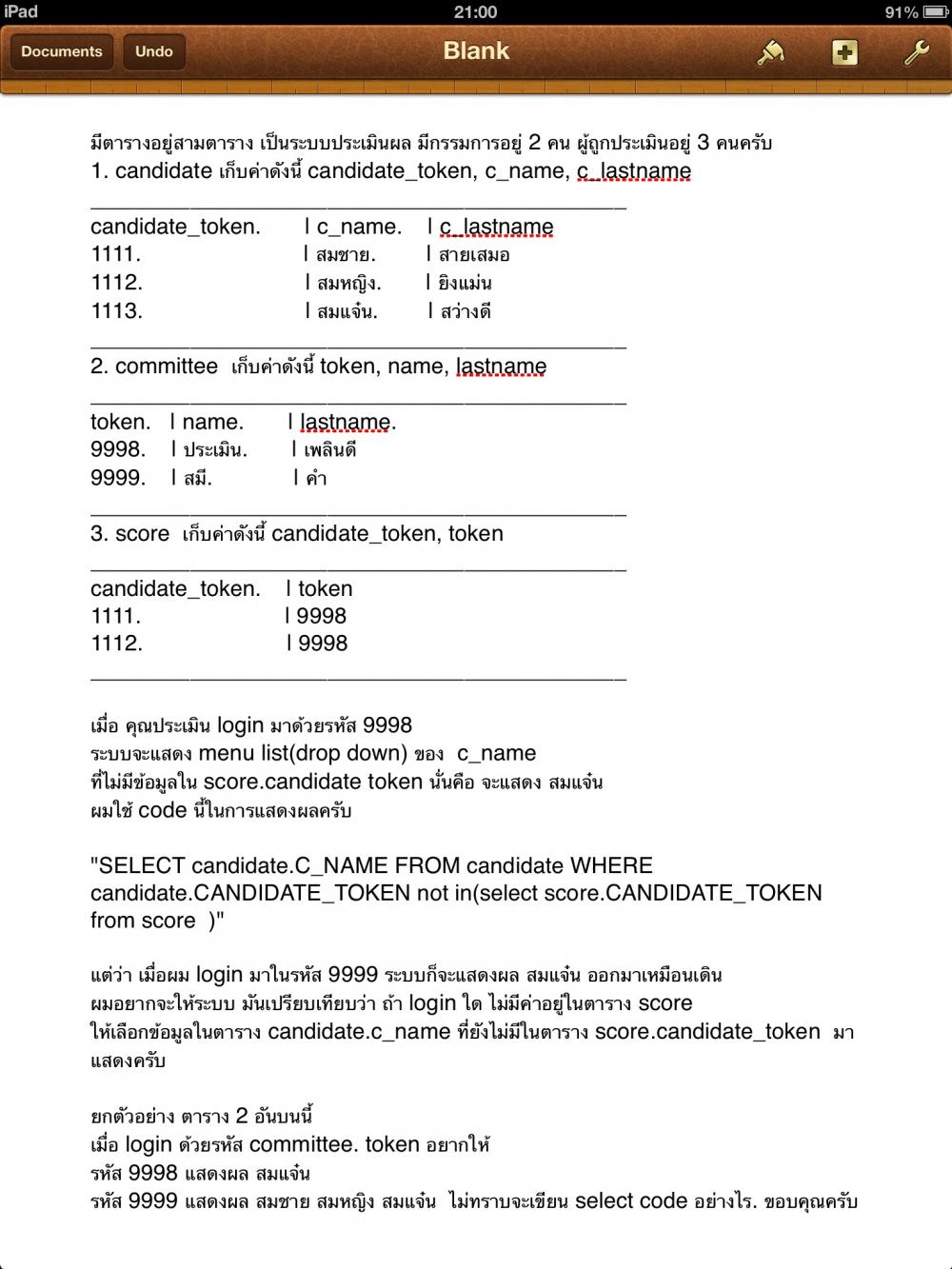 select * from candidate where can_token not in (select can_token from committee c , score s where c.token = s.token and c.token = '9999') // c.token เป็น ค่าที่ id ที่ login เข้ามา