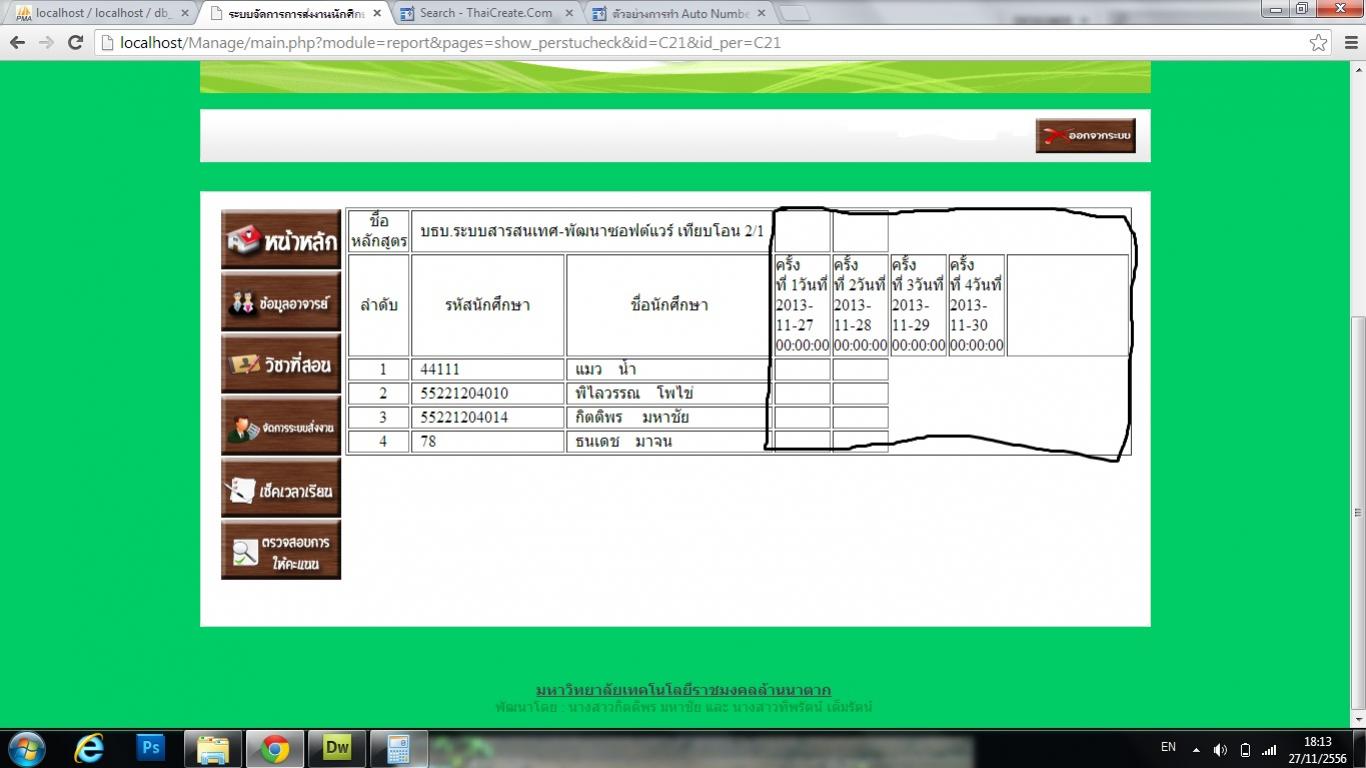 <? @session_start(); require_once("config.php"); require_once("class/Table.class.php"); $per_id=$_GET[id]; ?> <meta http-equiv="Content-Type" content="text/html; charset=utf-8" /> <form name="form1" method="post" action=""> <table width="100%" border="1" cellspacing="2" cellpadding="2"> <tr> <td width="8%" align="center">ชื่อหลักสูตร</td> <td colspan="2"> <? $show_ids=$_GET['id']; $tbs=new Table(); $sqls="select * from tb_course where course_id='$show_ids'"; $tbs->setSQL($sqls); $datas=$tbs->getTable(); $ds=mysql_fetch_object($datas); echo $ds->course_name; ?></td> <td> </td> <td> </td> </tr> <tr> <td align="center">ลำดับ</td> <td align="center">รหัสนักศึกษา</td> <td align="center">ชื่อนักศึกษา</td> <? $tbw=new Table(); $sqlw="select check_date,count(check_date) from tb_check group by check_date having count(check_date)"; $tbw->setSQL($sqlw); $dataw=$tbw->getTable(); while ($dw = mysql_fetch_object($dataw)){ $s++; ?> <td width="5%">ครั้งที่ <?=$s;?>วันที่ <?=$dw->check_date;?> </td> <? }?> <td width="16%"> </td> </tr> <? $id=$_GET['id']; $sub=$_GET['sub']; $tb=new Table(); $sql="select stu_id,count(stu_id) from tb_check where cours_id='$id' group by stu_id having count(stu_id)"; $tb->setSQL($sql); $datai=$tb->getTable(); while ($di = mysql_fetch_object($datai)){ $n++; ?> <? $tbq=new Table(); $sqlq="select * from tb_student where stu_id='$di->stu_id'"; $tbq->setSQL($sqlq); $dataq=$tbq->getTable(); ?> <? while ($dq = mysql_fetch_object($dataq)){ ?> <tr> <td align="center"> <?=$n;?> </td> <td width="20%"> <?=$di->stu_id;?> </td> <td> <?=$dq->stu_firstname."    ".$dq->stu_lastname;?> </td> <td width="5%"> </td> <td> </td> </tr> <? }?> <? }?> </table> </form>