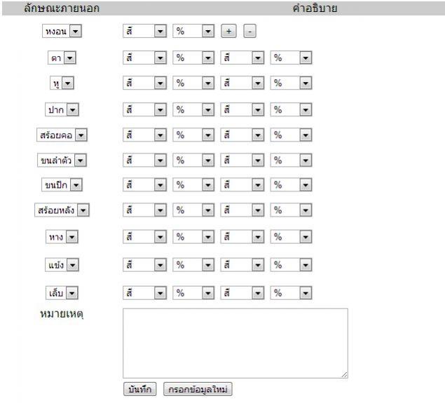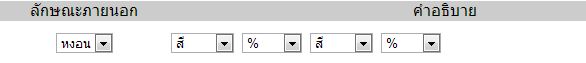 <meta http-equiv="Content-Type" content="text/html; charset=utf-8" /> <table width="600px" border="0"> <tr> <td width="26%">ประเภท</td> <td width="10%">สี</td> <td width="2%"> </td> <td width="62%"> </td> </tr> <tr> <td>หงอน</td> <td><select name="S1_1" id="S1_1"> <option value="ดำ">ดำ</option> <option value="แดง">แดง</option> <option value="ขาว">ขาว</option> </select> </td> <td><div id="H1_2" style="display:none;"> <select name="S1_2" id="S1_2"> <option value="ดำ">ดำ</option> <option value="แดง">แดง</option> <option value="ขาว">ขาว</option> </select></div></td> <td> <a href="#" onclick="document.getElementById('H1_2').style.display = 'block';">+</a> <a href="#" onclick="document.getElementById('H1_2').style.display = 'none';">-</a> </tr> <tr> <td>ขา</td> <td><select name="S2_1" id="S2_1"> <option value="ดำ">ดำ</option> <option value="แดง">แดง</option> <option value="ขาว">ขาว</option> </select></td> <td> <div id="H2_2" style="display:none;"> <select name="S2_2" id="S2_2"> <option value="ดำ">ดำ</option> <option value="แดง">แดง</option> <option value="ขาว">ขาว</option> </select> </div> </td> <td> <a href="#" onclick="document.getElementById('H2_2').style.display = 'block';">+</a> <a href="#" onclick="document.getElementById('H2_2').style.display = 'none';">-</a> </td> </tr> </table>