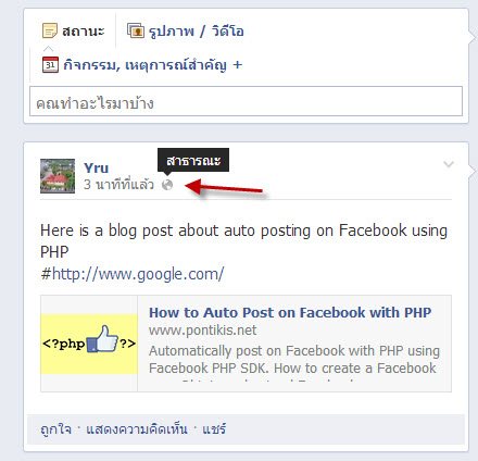 php sdk auto post on fanpage ทำไมเฟสของเพื่อนมองไม่เห็นโพสต์นี้ แต่ของเราเห็นคนเดียวครับ ทั้งๆที่มีเครื่องหมายสาธารณะครับ ไม่แน่ใจว่าควรแก้ตรงไหนครับ รบกวนพี่ๆช่วยแนะนำหน่อยครับ ขอบคุณครับ