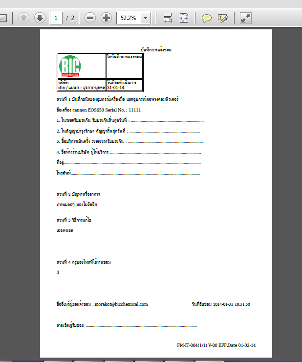 <?php include_once '../MPDF54/mpdf.php'; $mpdf = new mPDF('UTF-8'); $mpdf->SetAutoFont(); $mpdf->SetDisplayMode('fullpage'); $mpdf->WriteHTML('<div align="center">บันทึกการแจ้งซ่อม<div>'); $html .=' <table border="1"> <tbody> <tr> <td><img height="80" width="80" src="images/bic.png" /></td> <td valign="top" align="center">ใบบันทึกการแจ้งซ่อม</td> </tr> <tr> <td valign="top"> <p>บริษัท </p> <p>ฝ่าย / แผนก : ธุรการ-บุคคล</p> </td> <td valign="top"> <p>วันที่ขอดำเนินการ</p> <p> 31-01-14</p> </td> </tr> </tbody></table> '; $model = Request::model()->findAll(); foreach ($model as $r){ $html .= " <tr> <td valign= 'top' colspan='2' rowspan='2'> <p>ส่วนที่ 1 บันทึกชนิดของอุปกรณ์เครื่องมือ และอุปกรณ์ต่อพ่วงคอมพิวเตอร์</p> <p>ชื่อเครื่อง {$r->device->device_name} Serial No. : {$r->service_code}</p> <p>1. ในระยะรับประกัน รับประกันสิ้นสุดวันที่ : ....................................................................</p> <p>2. ในสัญญาบำรุงรักษา สัญญาสิ้นสุดวันที่ : ..................................................................</p> <p>3. ซื้อบริการเป็นครั้ง ระยะเวลารับประกัน : ......................................................................</p> <p>4. ชื่อห้างร้านบริษัท ผู้ให้บริการ :....................................................................................</p> <p>ที่อยู่................................................................................................................................</p> <p>โทรศัพท์.........................................................................................................................</p> </td> </tr> <tr> </tr> <tr> <td valign='top'> <p>ส่วนที่ 2 ปัญหาหรืออาการ</p> <p>{$r->request_problem}</p> </td> <td valign='top'> <p>ส่วนที่ 3 วิธีการแก้ไข</p> <p>{$r->request_repair_detail_work}</p> <p> </p> </td> </tr> <tr> <td valign='top' colspan='2'> <p>ส่วนที่ 4 สรุปอะไหล่ที่ใช้งานซ่อม </p> <p>{$r->device_id}</p> <p> </p> </td> </tr> <tr> <td valign='top' colspan='2'> <p>ชื่ออีเมล์ผู้ขอแจ้งซ่อม : {$r->employee->employee_email} วันที่รับซ่อม {$r->request_start_repair_date}</p> <p> </p> <p>ลายเซ็นผู้รับซ่อม ........................................................................................................</p> </td> </tr> <tr> <td colspan='2'></td> </tr> "; } $html .=' </tbody> </table> <br /> '; $mpdf->SetHTMLFooter(' <div align="right">FM-IT-004(1/1) V-00 EFF.Date 01-02-14</div> '); $mpdf->WriteHTML($html); $mpdf->Output('yok/mpdf.pdf','F'); ?>