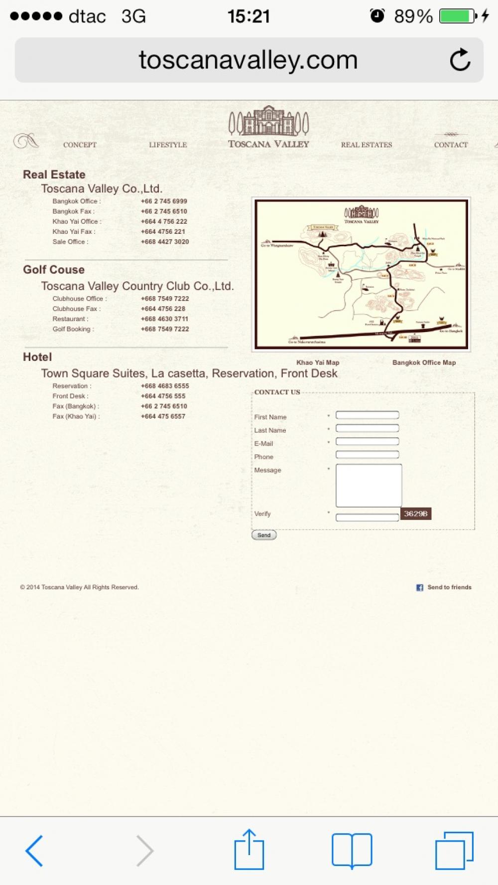 <div id="maincontent"> <div class="header"><b>Real Estate</b></div> <div class="title">Toscana Valley Co.,Ltd.</div> <ul class="showInColumn"> <li>Bangkok Office :</li> <li>+66 (2) - 745 6999</li> <li>Bangkok Fax :</li> <li>+66 (2) - 745 6510</li> <li>Khao Yai Office :</li> <li>+66 (44) - 756 222</li> <li>Khao Yai Fax :</li> <li>+66 (44) - 756 221</li> <li>Sale Office :</li> <li>+66 (84) - 427 3020</li> <li div style="border-bottom:solid 1px #999; width:400px;"> </li> </ul> <div class="headerGolf"><b>Golf Couse</b></div> <div class="titleTOSCC">Toscana Valley Country Club Co.,Ltd.</div> <ul class="showInColumn"> <li>Clubhouse Office :</li> <li>+66 (87) - 549 7222</li> <li>Clubhouse Fax :</li> <li>+66 (44) - 756 228</li> <li>Restaurant :</li> <li>+66 (84) - 630 3711</li> <li>Golf Booking :</li> <li>+66 (87) - 5497 222</li> <li div style="border-bottom:solid 1px #999; width:400px;"> </li> </ul> <div class="headerhotel"><b>Hotel</b></div> <div class="titlehotel">Town Square Suites, La casetta, Reservation, Front Desk</div> <ul class="showInColumn"> <li>Reservation :</li> <li>+66 (84) - 683 6555</li> <li>Front Desk :</li> <li>+66 (44) - 756 555</li> <li>Fax (Bangkok) :</li> <li>+66 (2) - 745 6510</li> <li>Fax (Khao Yai) :</li> <li>+66 (44) - 756 557</li> </ul> <div class="map"><a href="p/fullmap.gif" class="thickbox"><img src="p/map.gif" alt="map" class="pageimage" width="420" height="294" /></a></div> <ul class="showInColumnmap"> <li><a href="../download/mapsite.pdf">Khao Yai Map</a></li> <li><a href="../download/mapbkk.pdf">Bangkok Office Map</a></li> </ul>