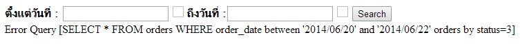 <form> <font face="MS Sans Serif"> <!-- ข้อควรระวัง : ชื่อของ Input จะต้องมี name เป็นค่าเดียวกับที่อยู่ในส่วน <a href=...> ด้วยนะครับ ดูตัวอย่างการใช้ด้านล่าง สังเกตตรงคำว่า date นะ --> <b>ตั้งแต่วันที่ : </b></font><input name="date" size="20"> <a href="javascript:displayDatePicker('date')"> <img border="0" src="formcal.gif" width="16" height="16"></a> <font face="MS Sans Serif"> <b>ถึงวันที่ :</b></font><input name="date2" size="20"> <a href="javascript:displayDatePicker('date2')"> <img border="0" src="formcal.gif" width="16" height="16"></a> <input type="submit" name="Submit" value="Search"> </form> <? include("connect.php"); $strSQL = "SELECT * FROM orders WHERE order_date between '$date' and '$date2' orders by status=3"; $objQuery = mysql_query($strSQL) or die ("Error Query [".$strSQL."]"); ?> </p> <table width="703" height="71" border="1"> <tr bgcolor="#FFB6C1"> <th width="77" height="27"> <div align="center">ลำดับ</div></th> <th width="208"> <div align="center">วันที่</div></th> <th width="203"> <div align="center">เลขที่สั่งใบสั่งซื้อ</div></th> <th width="187"> <div align="center">จำนวน (บาท)</div></th> <th width="187"> <div align="center">สถานะ</div></th> </tr> <? $i = 1; while($objResult = mysql_fetch_array($objQuery)) { ?> <tr> <td><div align="center"><?=$i;?></div></td> <td><div align="center"><?=$objResult["order_date"];?></div></td> <td align="center"><?=$objResult["order_id"];?></td> <td align="right"><?=$objResult["order_total"];?></td> <td width="157" align="center"><? if ($objResult['status']=="3") { echo "<span class=style4 style=color:gray;font-weight:normal;>ส่งสินค้าแล้ว</span>"; } ?> </td> </tr> <? $i++; } ?> </table>