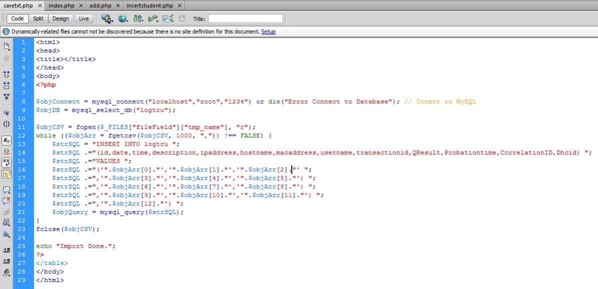 สมมุติว่า log นี้ชื่อ test.txt มี 3 เร็คคอร์ดนะครับ ผมอยากจะอัพไฟล์นี้ไปไว้ในฐานข้อมูล โดยให้ฐานข้อมูลสร้างตารางใหม่ขึ้นมา