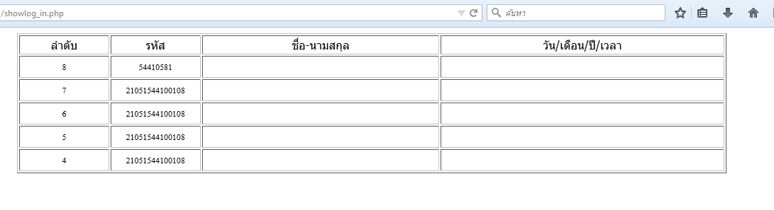 <?php //include "chksession.php"; include "connect.php"; //include "function.php"; ?> <html> <title></title> <? // เชื่่อมต่อฐานข้อมูล $host="localhost"; // กำหนด host $username="root"; // กำหนด username $pass_word="root"; // กำหนด Password $db="libedb"; // กำหนดชื่อฐานข้อมูล $Conn = mysql_connect( $host,$username,$pass_word) or die ("ติดต่อฐานข้อมูลไม่ได้");// ติดต่อฐานข้อมูล mysql_query("SET NAMES utf8",$Conn); // set กำหนดมาตราฐาน mysql_select_db($db) or die("เลือกฐานข้อมูลไม่ได้"); // เลือกฐานข้อมูล //---> ?> <table width="1000" border="1" cellspacing="2" cellpadding="2"align="center"> <tr> <td width="91"><div align="center">ลำดับ</div></td> <td width="91"><div align="center">รหัส</div></td> <td width="250"><div align="center">ชื่อ-นามสกุล</div></td> <td width="300"><div align="center">วัน/เดือน/ปี/เวลา</div></td> </tr> <?php $sql_show = "SELECT *FROM test_mysql_in ORDER BY test_id DESC LIMIT 0,5"; $result_show = mysql_query($sql_show) or die(mysql_error()); while($row_show = mysql_fetch_array($result_show)) { $start++; $test_id=$row_show["test_id"]; $user_id_card=$row_show["user_id_card"]; ?> <tr> <td align='center'><font face='Angsana New' size='4.5' color='#000000'><? echo $test_id?></font></td> <td align='center'><font face='Angsana New' size='4.5' color='#000000'><? echo $user_id_card?></font></td> <td><div align="center"> <font face='thaisarabunpsk' size='2' color='#000000'><? echo $tit_name?> <? echo $user_fname?> <? echo $user_lname?></font></td> <td><div align="center"> <font face='thaisarabunpsk' size='2' color='#000000'><? echo $datenow ?></font></td> </tr> <? } ?> </table> </html>