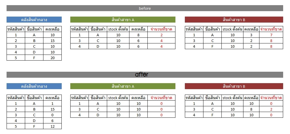 เรียน พี่ๆ ทุกท่านครับ พอดีผมกำลังทำระบบเพื่อออกใบเบิกสินค้าอัตโนมัติ โดยเมื่อกดปุ่ม Generate order ระบบก็จะเช็คว่าแต่ละสาขามีสินค้าตัวไหนขาดบ้าง จากนั้นถ้าที่คลังสินค้ากลางมีสินค้า ก็จะออกใบเบิกสินค้ามาให้กับสาขาพร้อมกับตัดสต็อกของส่วนกลางด้วย ทั้งนี้หากจำนวนสินค้าที่ขาดของสาขา A+B+...(รหัสสินค้า 3) มีจำนวนมากกว่า จำนวนสินค้าคงเหลือของคลังสินค้ากลาง ก็จะเบิกได้ตามจำนวนคงเหลือของส่วนกลาวงเท่านั้น แสดงว่าจะต้องมีบางสาขาที่ไม่ได้ของ รบกวนขอคำแนะนำหรือตัวอย่างด้วยนะครับ ขอบคุณครับ