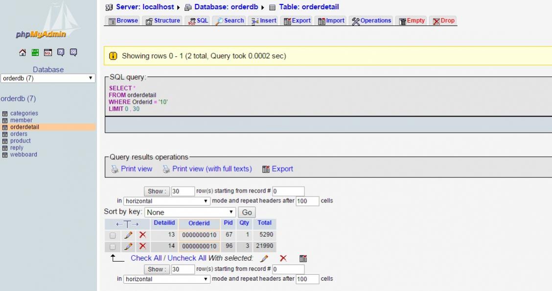 $strSQL2="SELECT tb.*,tb2.* FROM orderdetail tb , product tb2 WHERE tb.Orderid = '".intval($objResult["Orderid"])."' AND tb.Pid = tb2.Pid";