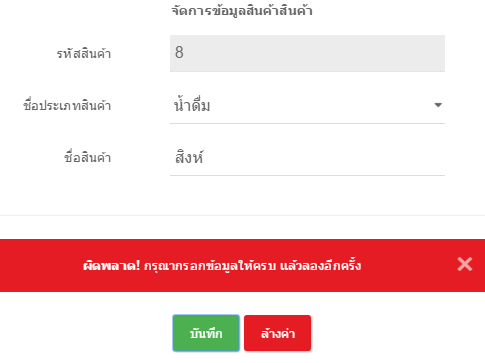 จะเหลือไว้แค่ฟิลล์ รหัสสินค้า,ชื่อประเภทสินค้า,ชื่อสินค้า ...พอเพิ่มข้อมูลและแก้ไขข้อมูลสินค้าเข้าไป มันยังแจ้งว่า กรอกข้อมูลไม่ครบอยู่เลยครับ ตามภาพด้านล่าง !
